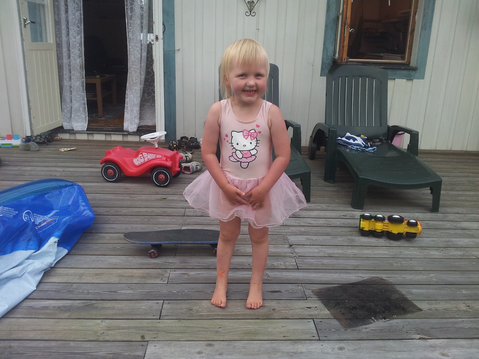 Stolt tjej i kusinens gamla jympadräkt. Den skulle hon minsann ha på sig när vi åkte till Bygg-Max och köpte innerdörrar. Men med tights och en munkjacka så blev det lite mer påklätt :)
